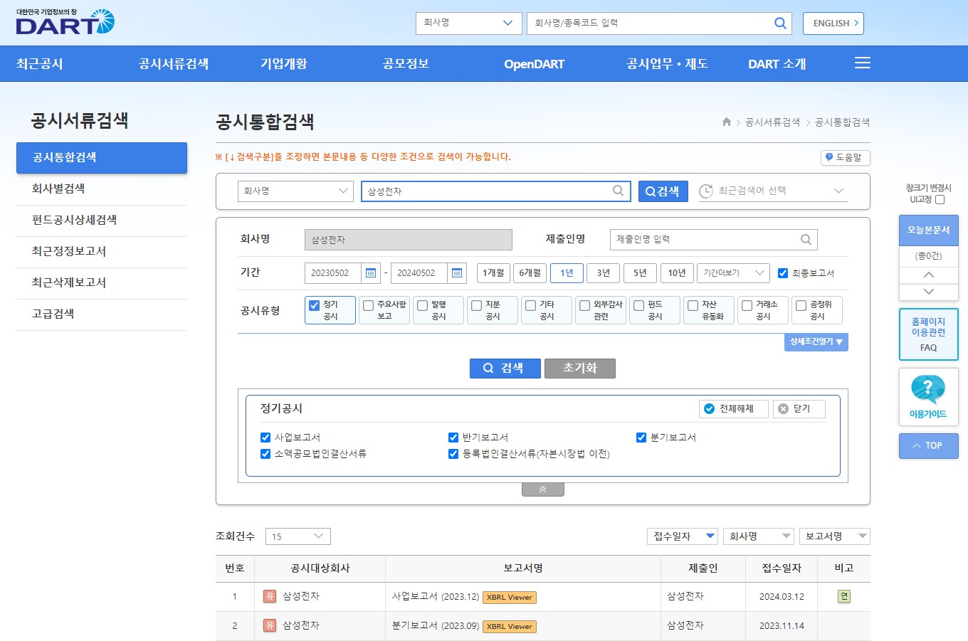 전자 공시 홈페이지에 접속 후,