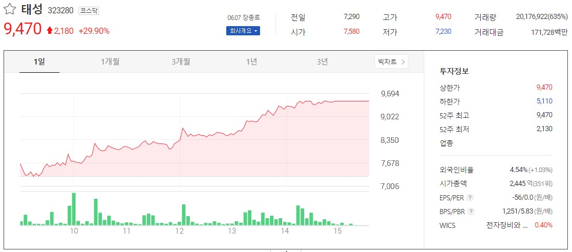 어제 태성 주가가 상한가를 찍었다는 소식에 깜짝 놀랐어요.